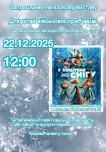 Для дітей військовослужбовців (учасників бойових дій та діючих захисників України) «У пошуках снігу» 22 грудня 2025 року Початок о 12:00 год. Закарпатський обласний театр драми та комедії. Адреса: м. Хуст, вул. Карпатської Січі, 22. Казкова зимова історія подарує дітям щирі емоції, гарний настрій та відчуття справжнього свята. Радо чекаємо на вас! ...