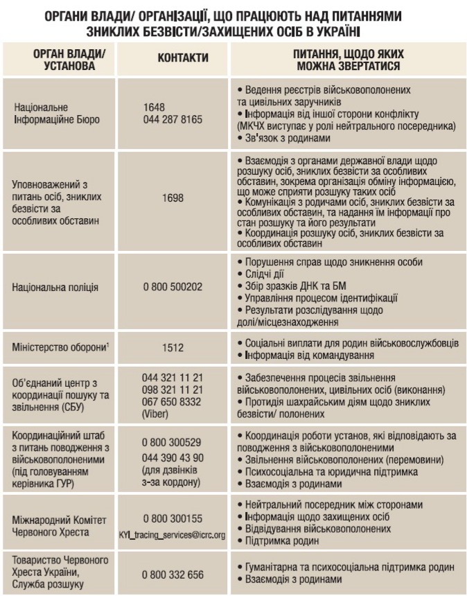 Органи влади/організації, що працюють над питаннями зниклих безвісти/захищених осіб в Україні
