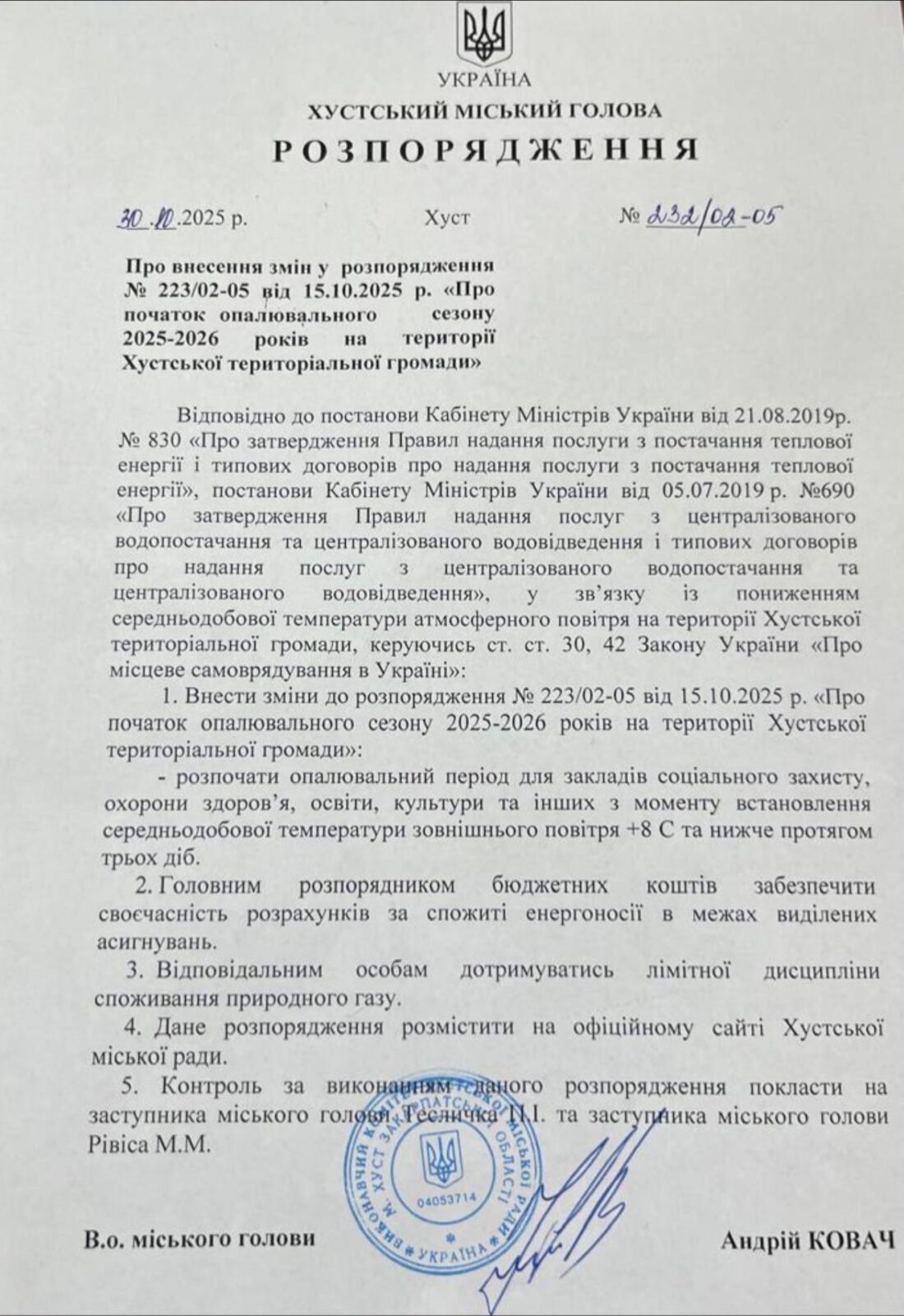 Розпорядження в.о. міського голови «Про початок опалювального сезону 2025-2026 років на території Хустської міської територіальної громади