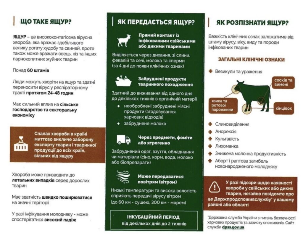 У разі появи ознак захворювання, незвичної поведінки тварин або їх масової загибелі необхідно негайно звернутися до ветеринарного лікаря або повідомити спеціалістів Держпродспоживслужби.